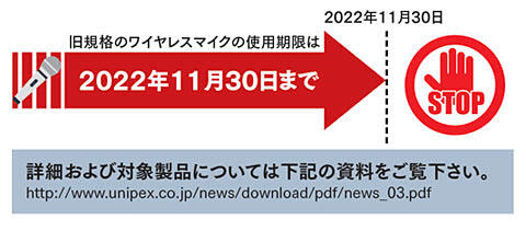 - 弊社で販売しておりますユニペックス製ワイヤレスマイクについても2005年の改正以降は、改正後の技術基準で「技術基準適合証明・工事設計認証」を受けておりますが、それまでにご購入頂いたお客様のワイヤレスマイク(改正前に「技術基準適合証明・工事設計認証」を受けたワイヤレスマイク)は、猶予期限として2022年11月30日までしかご使用頂けません。